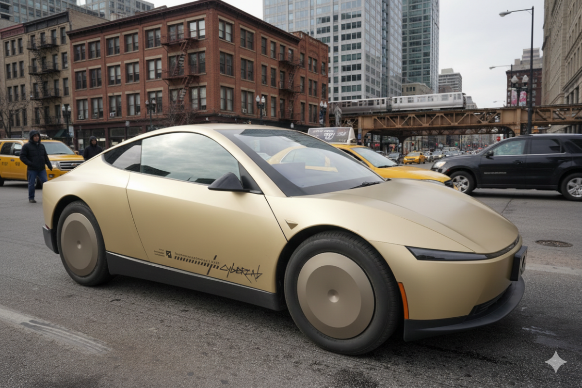 Yes, the gold-finished doorstop with the butterfly doors Tesla Cybercab, or “Robotaxi,” is officially on display at the 2026 Chicago Auto Show.